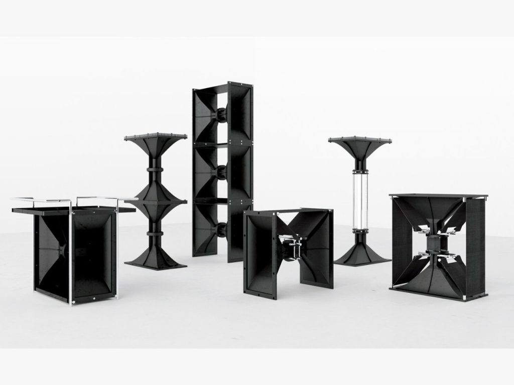 La Série Horn réinvente des composants de haut-parleurs jetés, en les transformant en objets fonctionnels et sculpturaux pour les foyers modernes. Le processus de design commence par la collecte manuelle de pièces de haut-parleurs inutilisées, directement auprès de fournisseurs et d’inventaires abandonnés. Les composants récupérés, notamment les cornes, les cadres de haut-parleurs, et les structures porteuses, ne servent pas seulement à l’esthétique. Ils deviennent les éléments structurels et visuels clés qui façonnent l’identité particulière de chaque pièce de la série.