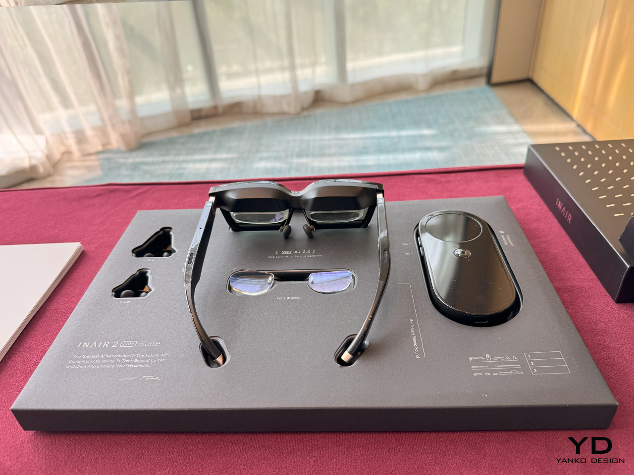 Le **INAIR AI Spatial Computer** se compose de plusieurs éléments clés : de légers lunettes permettant d’accéder à l’écran en réalité virtuelle, le pod INAIR qui constitue le cœur de l’appareil alimenté par l’intelligence artificielle, et un clavier Touchboard sans fil muni de gestes tactiles personnalisés pour interagir avec l’espace 3D.