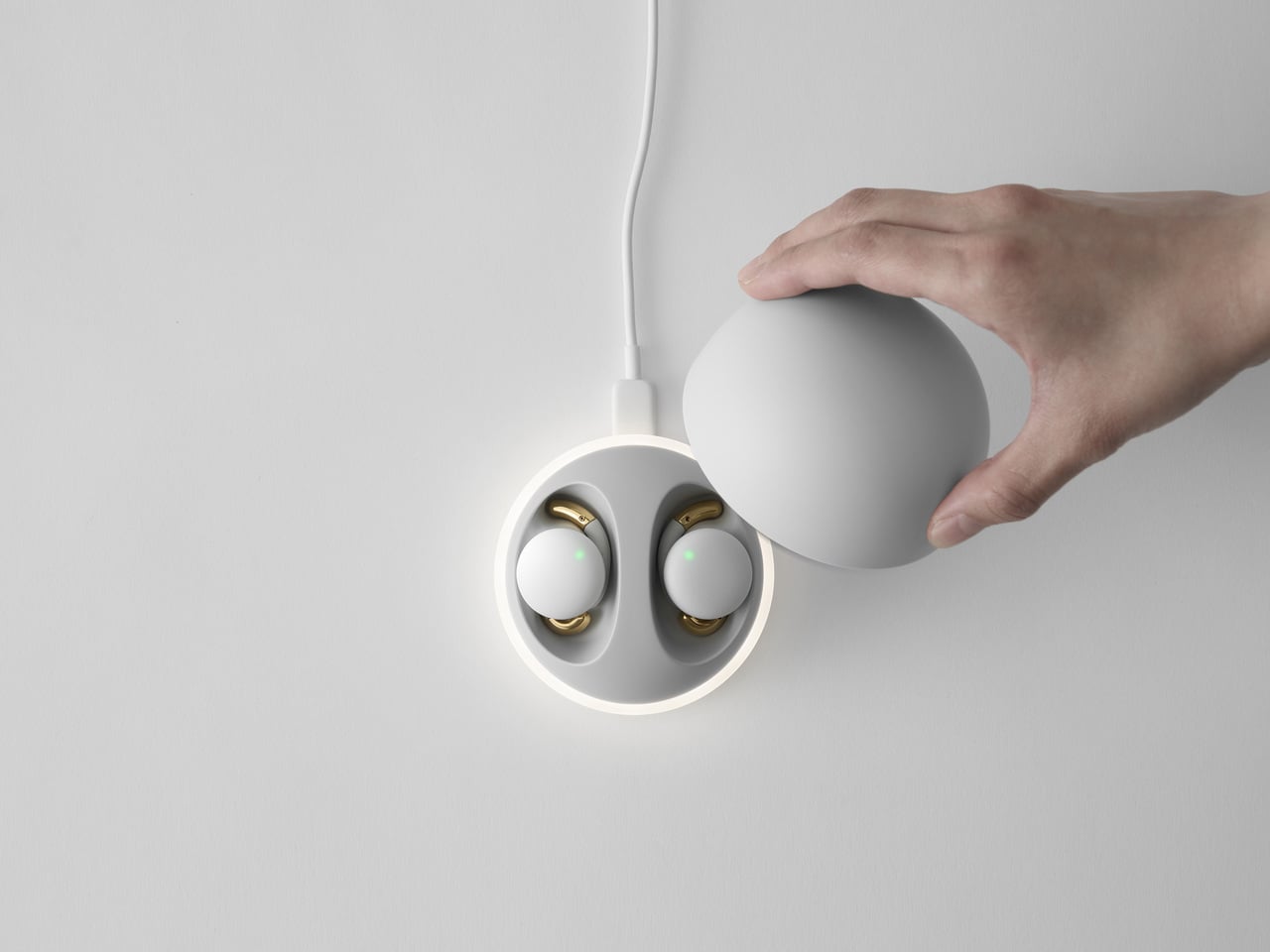Le design du support a débuté avec l’idée d’un petit objet posé sur la table de nuit, plutôt qu’un simple dock technologique. Grâce à la technologie « knock-on » de LG, un simple tapotement sur le couvercle active ou désactive un halo LED doux et indirect. Le dessus, maintenu par des aimants, s’ouvre pour révéler les oreillettes, dont le poids est équilibré de manière à offrir une sensation de stabilité rassurante lorsque vous l’atteignez dans l’obscurité.