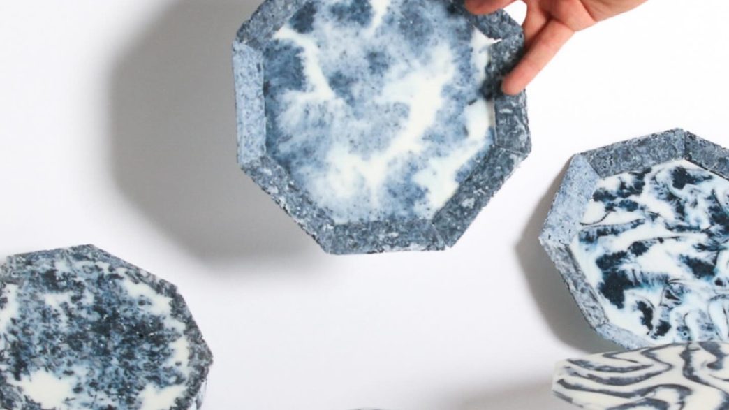 Le projet Denim transforme des jeans usagés en les regroupant et en les moulant avec divers matériaux tels que de la colle à bois, du plâtre et de la résine. Ce processus permet de créer des assiettes décoratives uniques.