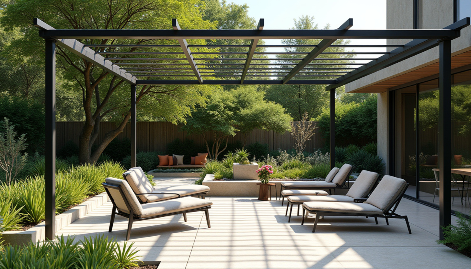 Très en vogue, la pergola métallique est une solution idéale pour créer un espace ombragé sur une terrasse, près d’une piscine ou dans un coin détente. Les tubes en acier permettent des structures fines mais solides, avec des portées importantes sans poteaux intermédiaires. Cela donne une impression d’ouverture et de légèreté.