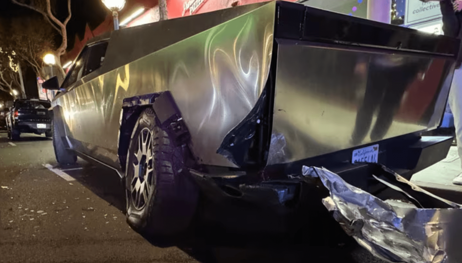 Une « berline compacte » a percuté la roue arrière et la zone du pare-chocs côté conducteur du Cybertruck alors qu’il était stationné. Comme on peut le voir sur l’image ci-dessus, les dégâts ne semblaient pas trop importants, surtout pour un camion de 2 700 kg après un impact avec une berline beaucoup plus petite.