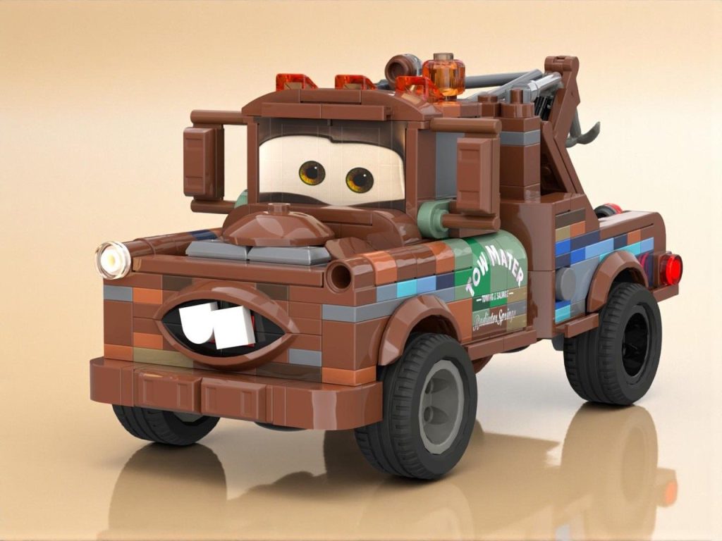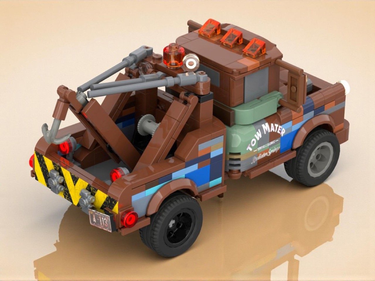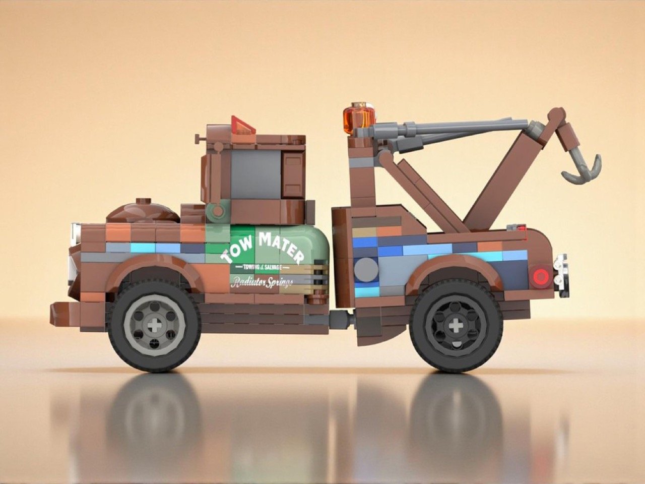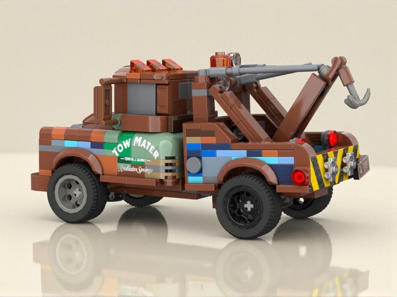 Le modèle utilise des techniques SNOT (studs not on top) autour de l’avant pour créer la forme arrondie essentielle au visage amical de Mater, et il présente également un assemblage fonctionnel pour le crochet de remorquage.